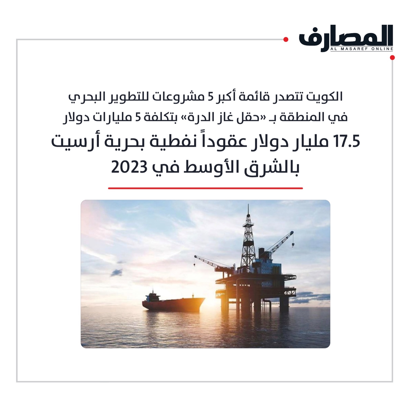 الكويت تتصدر قائمة أكبر 5 مشروعات للتطوير البحري في المنطقة بـ «حقل غاز الدرة» بتكلفة 5 مليارات دولار17.5 مليار دولار عقوداً نفطية بحرية أرسيت بالشرق الأوسط في 2023