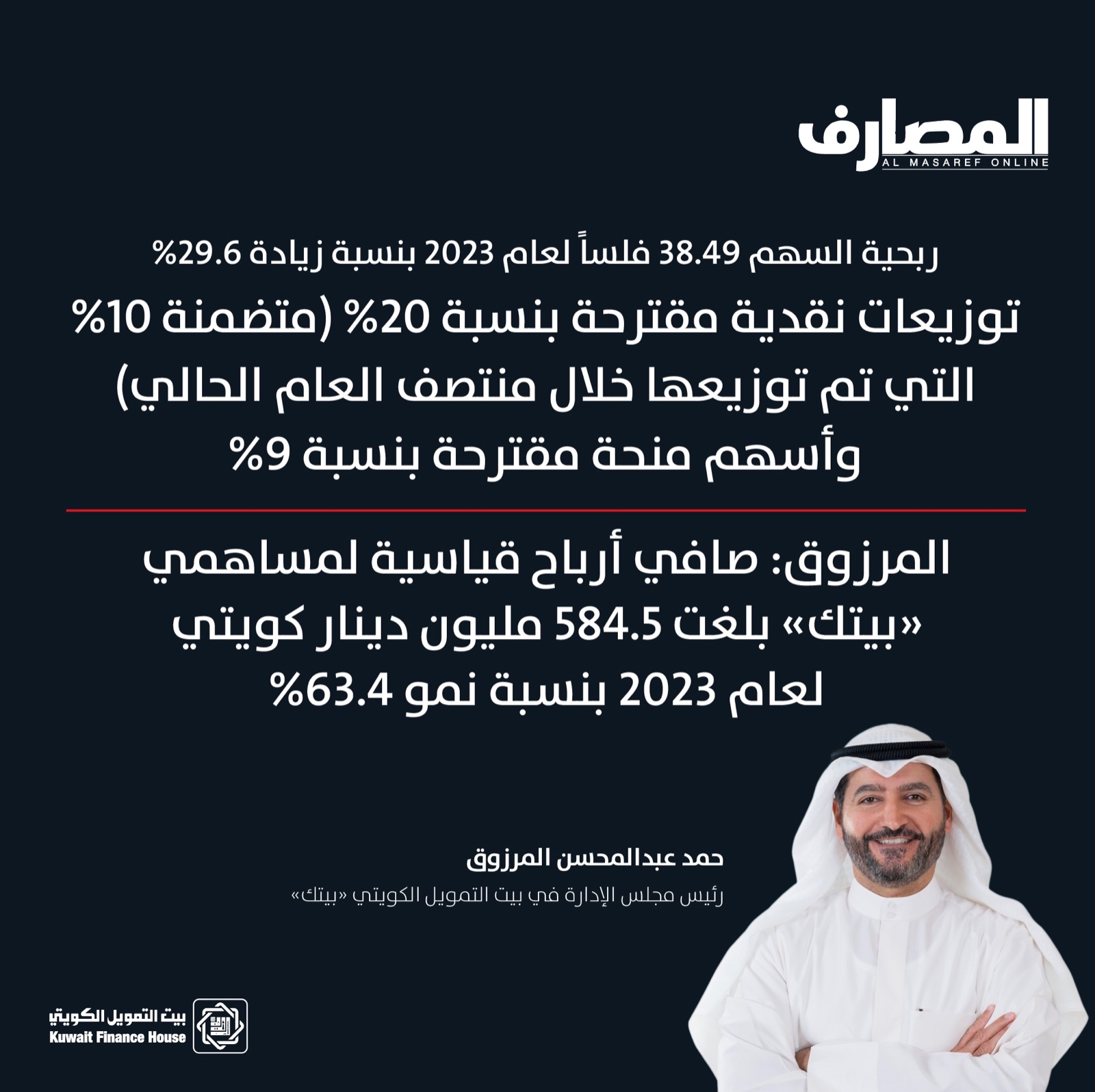 المرزوق: صافي أرباح قياسية لمساهمي “بيتك” بلغت 584.5 مليون دينار كويتي لعام 2023  بنسبة نمو 63.4%