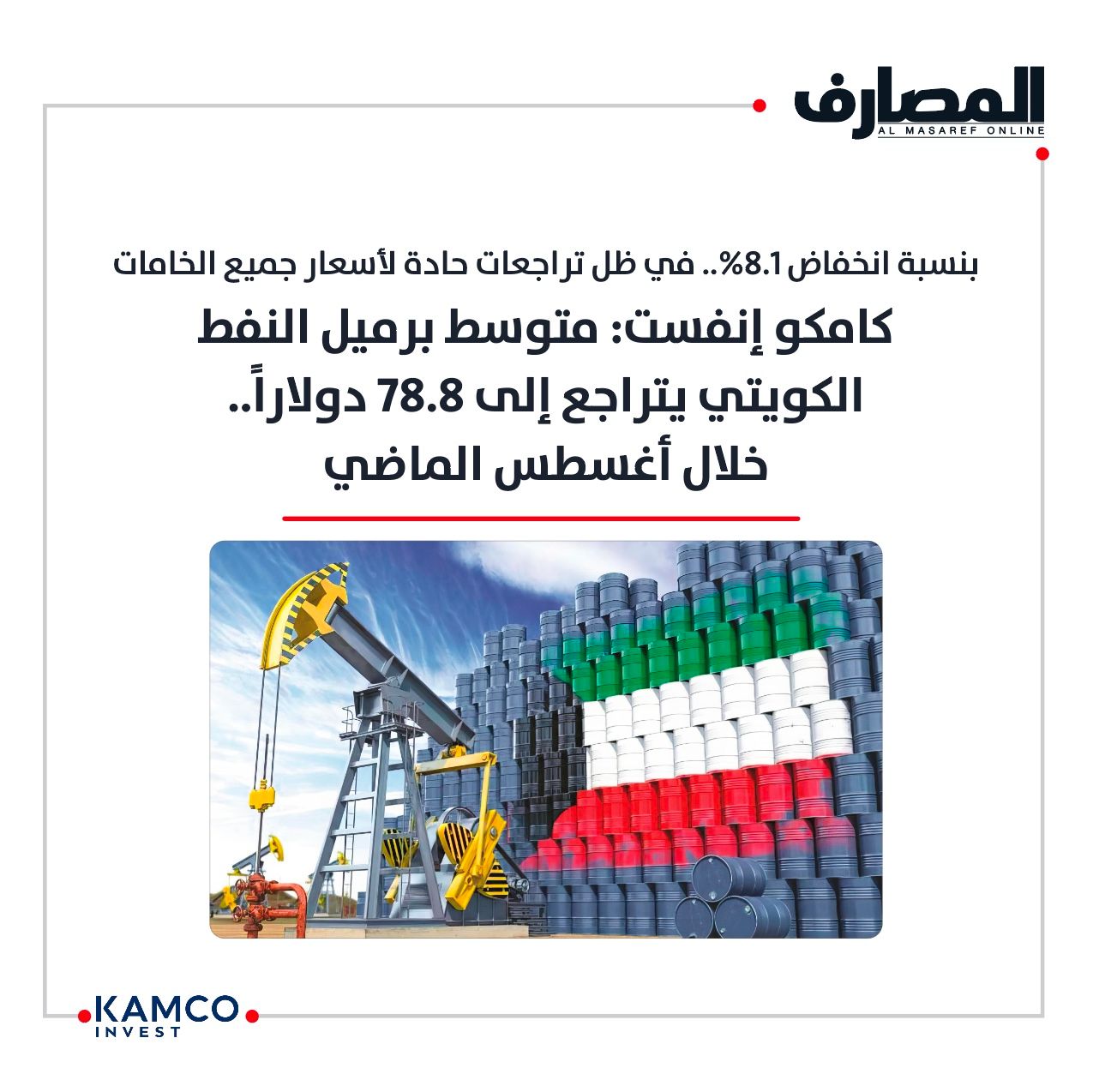 بنسبة انخفاض 8.1%.. في ظل تراجعات حادة لأسعار جميع الخامات«كامكو إنفست»: متوسط برميل النفط الكويتي يتراجع إلى 78.8 دولاراً.. خلال أغسطس الماض