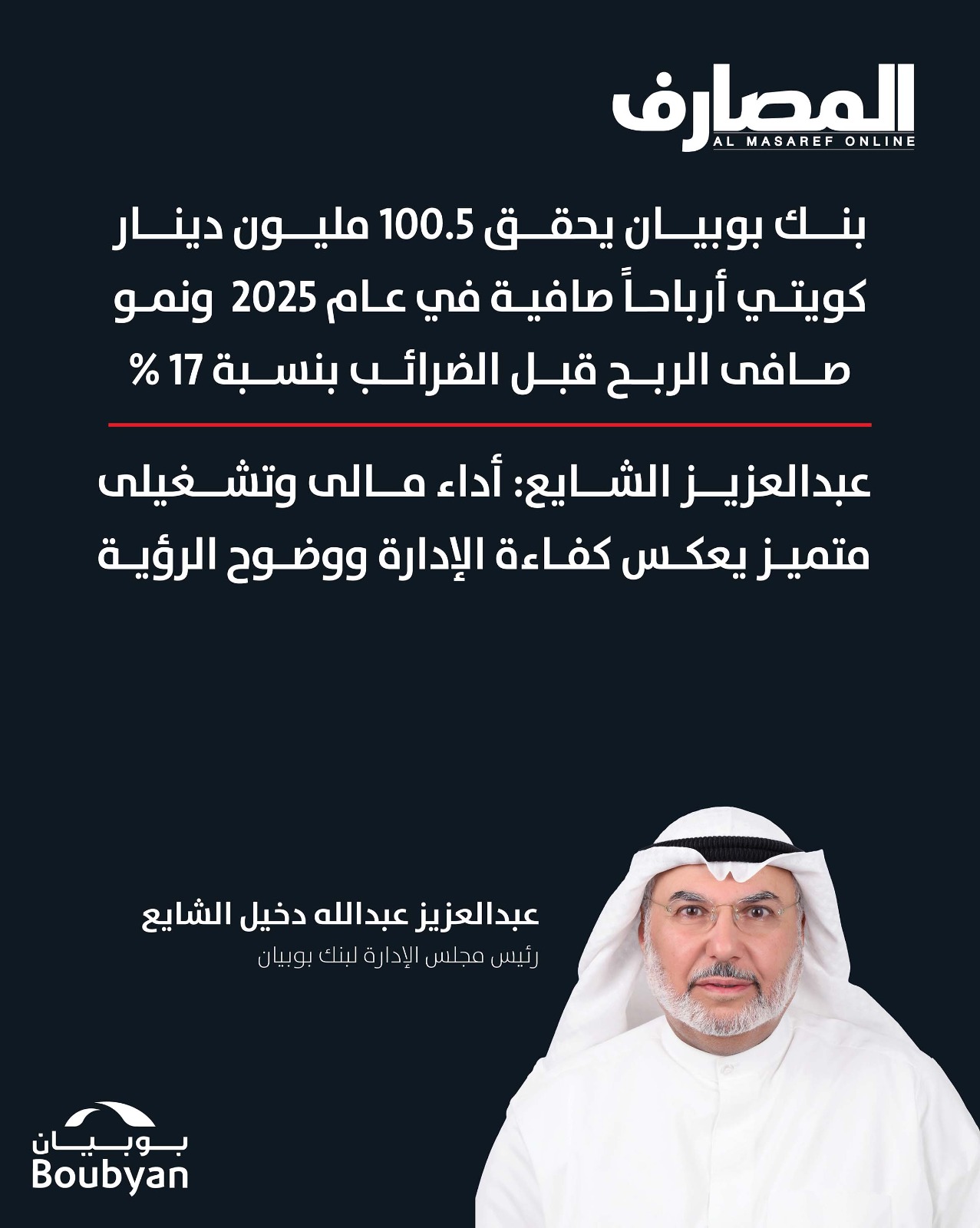 التقارير بنك بوبيان يحقق 100.5 مليون دينار كويتي أرباحاً صافية في عام 2025 ونمو صافى الربح قبل الضرائب بنسبة 17% February 16, 2026 Posted by Abdul Wahab 16 Feb تحميل PDF قراءة