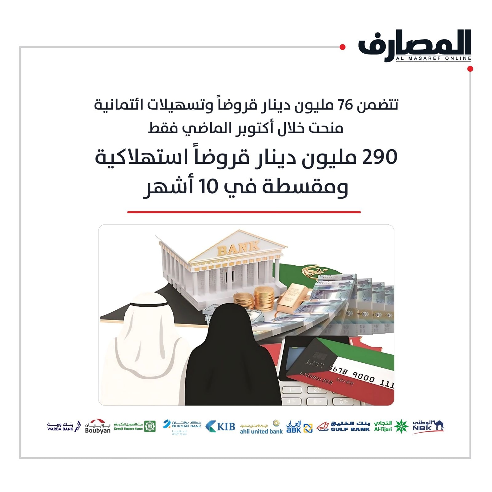 تتضمن 76 مليون دينار قروضاً وتسهيلات ائتمانية منحت خلال أكتوبر الماضي فقط290 مليون دينار قروضاً استهلاكية ومقسطة في 10 أشهر