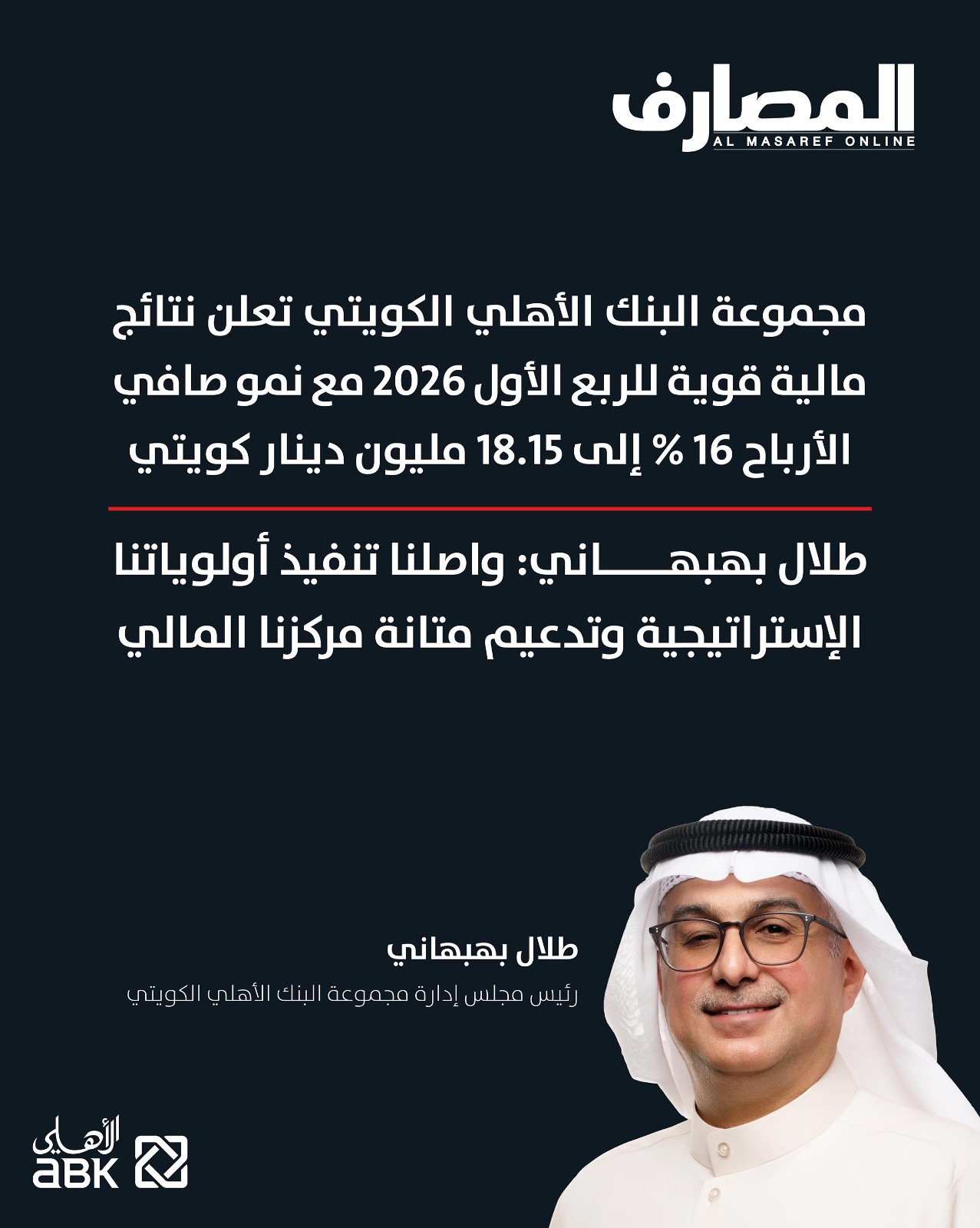 التقارير مجموعة البنك الأهلي الكويتي تعلن نتائج مالية قوية للربع الأول 2026 مع نمو صافي الأرباح 16% إلى 18.15 مليون دينار كويتي April 28, 2026 Posted by Abdul Wahab 28 Apr تحميل PDF قراءة