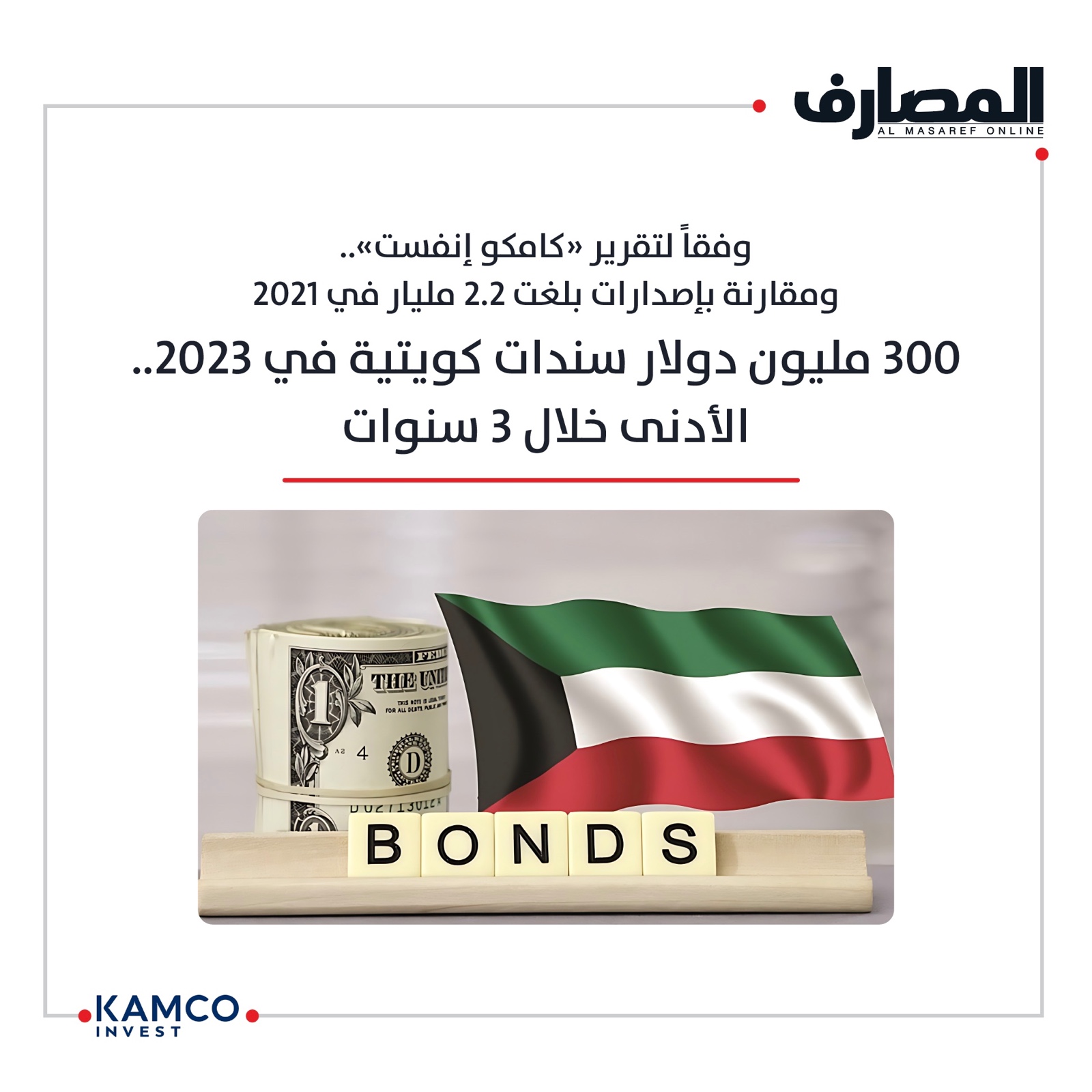 وفقاً لتقرير «كامكو إنفست».. ومقارنة بإصدارات بلغت 2.2 مليار في 2021300 مليون دولار سندات كويتية في 2023.. الأدنى خلال 3 سنوات